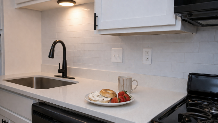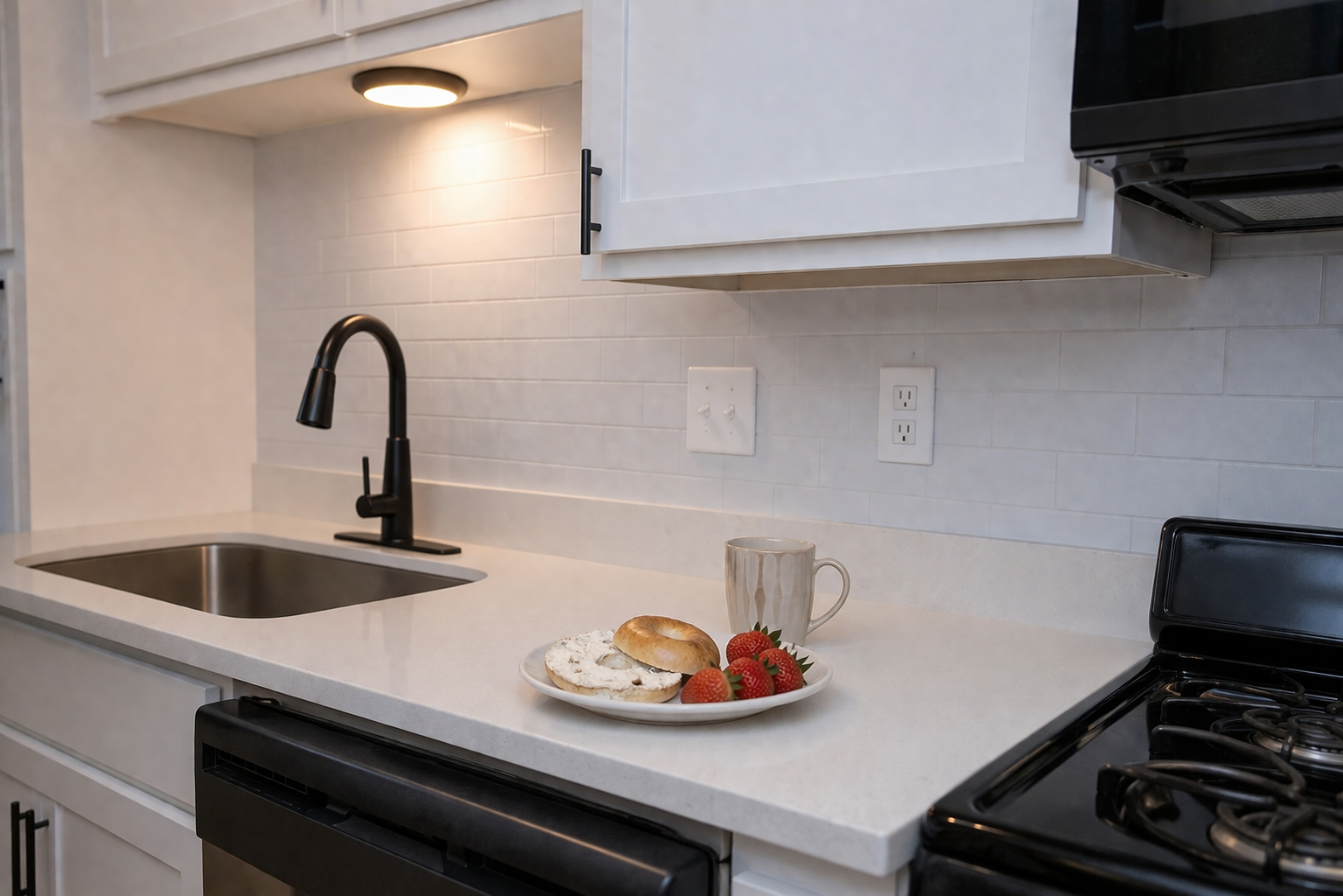 - Upgraded modern designed cabinets with brush nickel and black finishes*